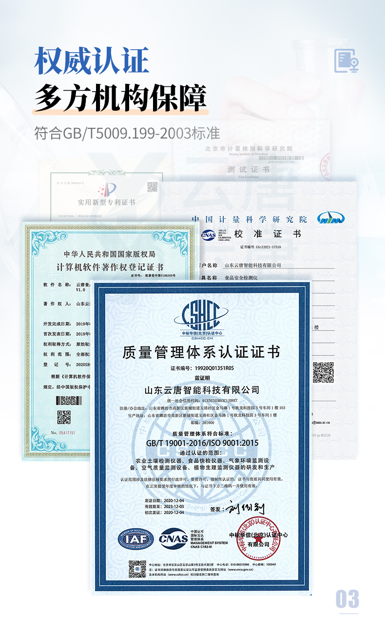 儀器采用手提式一體化系統(tǒng)檢測技術(shù),將分光光度模塊、膠體金檢測模塊、新型農(nóng)殘檢測模塊、數(shù)字化管理模塊、無線通訊模塊高度集成于一體,支持檢測200種食品安全檢測項(xiàng)目,同時(shí)預(yù)留升級(jí)檢測方法。儀器檢測模塊標(biāo)準(zhǔn)化、智能化,檢測項(xiàng)目可隨意自由組合。檢測箱體內(nèi)置多個(gè)標(biāo)準(zhǔn)檢測單元,檢測模塊可以調(diào)整配置。顯示屏幕:儀器采用10.1英寸豎向液晶觸摸屏顯,搭配運(yùn)行安卓智能操作系統(tǒng),主控芯片采用ARM Cortex-A7,RK3288/4核處理器,主頻1.88Ghz,操作方便,性能更強(qiáng)。檢測通道:≥12通道;采用精密旋轉(zhuǎn)比色池設(shè)計(jì),使用同芯片同光源校準(zhǔn)精度,解決不同光源之間的誤差值,更加準(zhǔn)確**。(1-12通道間誤差0.1%,***:**202022821055.2)儀器光源:高精度進(jìn)口四波長冷光源,每個(gè)通道均配置 410、520、590、630nm 波長光源,標(biāo)配**的光路切換裝置,專利光路切換功能可實(shí)現(xiàn)64波長,并且所有檢測項(xiàng)目可實(shí)現(xiàn)所有通道同時(shí)檢測。設(shè)備可一鍵校準(zhǔn),自動(dòng)保存校準(zhǔn)數(shù)據(jù),自動(dòng)對(duì)比校驗(yàn),得到精準(zhǔn)光源,采用Android SP存儲(chǔ)數(shù)據(jù),光源數(shù)據(jù)永不丟失,方便每一次使用。通訊接口:配備無線通信模塊、4G(APN)通訊模塊、藍(lán)牙傳輸,同時(shí)具有雙USB接口以及RJ45網(wǎng)線接口,可以多方式實(shí)現(xiàn)數(shù)據(jù)保存及數(shù)據(jù)傳輸。存儲(chǔ)方式:支持U盤存儲(chǔ),標(biāo)準(zhǔn)USB接口,免驅(qū)動(dòng)安裝。檢測結(jié)果存儲(chǔ)容量20萬條以上,可生成Excel表格進(jìn)行拷貝,并具有登錄保護(hù)功能。智能化操作系統(tǒng):: ★操作系統(tǒng):儀器可在同一檢測界面自動(dòng)對(duì)應(yīng)相關(guān)檢測通道,一次性選擇1-12個(gè)樣品名稱,無需退出界面,節(jié)省操作時(shí)間。并可以對(duì)每個(gè)通道屬性和樣品信息單獨(dú)進(jìn)行編輯,例如送檢單位、人員,檢測人員等,打印時(shí)勾選打印顯示。★數(shù)據(jù)集成系統(tǒng):設(shè)備首頁自動(dòng)匯總分析檢測數(shù)據(jù),包含:周檢測數(shù)據(jù)、月檢測數(shù)據(jù),全部檢測總數(shù)量,均包含檢測總數(shù),合格數(shù),不合格數(shù),以及相關(guān)柱形分析圖,各項(xiàng)檢測數(shù)據(jù)一目了然,無需電腦查詢,更加快捷直觀。★數(shù)據(jù)庫系統(tǒng):十幾項(xiàng)數(shù)據(jù)庫分類管理儀器:包含項(xiàng)目類型、項(xiàng)目數(shù)據(jù)、檢測數(shù)據(jù)、歷史記錄、國標(biāo)信息、曲線信息、采樣信息、檢測信息、受檢信息、復(fù)核信息、圖表信息、光源校準(zhǔn)信息、打印樣式信息、樣品庫信息等等,數(shù)據(jù)庫之間互相協(xié)調(diào)聯(lián)動(dòng)保證數(shù)據(jù)的真實(shí)完整性。同時(shí)產(chǎn)品數(shù)據(jù)庫以及歷史檢測記錄支持一鍵檢索功能。★限量規(guī)判系統(tǒng):具有限量查詢、添加物質(zhì)合規(guī)判定系統(tǒng)。檢測出結(jié)果后,系統(tǒng)自動(dòng)調(diào)用系統(tǒng)數(shù)據(jù)庫中相關(guān)國標(biāo)進(jìn)行比對(duì)判定,客觀顯示判定結(jié)果是否合格★項(xiàng)目預(yù)設(shè)系統(tǒng):儀器具有任務(wù)預(yù)設(shè)模塊,一鍵提前預(yù)設(shè),給出方便快捷的新檢測方案,每一個(gè)任務(wù)分別可以設(shè)置不同的樣品、批次、編號(hào)、來源、備注、抽樣信息、檢測信息、受檢信息、復(fù)核信息等更多信息。樣品送檢時(shí)一鍵調(diào)取保存信息,并可多次調(diào)取,大大提高檢測效率。★數(shù)據(jù)監(jiān)管系統(tǒng):同步對(duì)接監(jiān)管平臺(tái),數(shù)據(jù)可局域網(wǎng)和互聯(lián)網(wǎng)數(shù)據(jù)上傳,檢測結(jié)果可選擇直接傳至食品安全監(jiān)管平臺(tái)。進(jìn)行區(qū)域食品安全監(jiān)管及大數(shù)據(jù)分析處理與數(shù)據(jù)統(tǒng)計(jì),檢測區(qū)域食品安全長短期動(dòng)態(tài),達(dá)到食品安全問題預(yù)估、預(yù)警。★打印系統(tǒng):內(nèi)置全新打印機(jī),新創(chuàng)自定義打印方式,可按需靈活勾選控制:產(chǎn)品合格證(國家農(nóng)業(yè)部標(biāo)準(zhǔn)要求),二維碼,抽樣信息、檢測信息,受檢信息、復(fù)核信息、抽樣日期、檢測日期等信息的打印。供電模式:儀器交直流兩用,直流12V供電,可連接車載電源,可配6ah大容量充電鋰電池,電量可實(shí)時(shí)顯示,方便戶外流動(dòng)測試。膠體金檢測模塊:采用雙通道CMOS成像處理技術(shù)及膠體金免疫層析技術(shù),可同時(shí)讀取雙膠體金卡數(shù)據(jù),自動(dòng)采集、處理分析,將檢測結(jié)果顯示,并可根據(jù)參考限值自動(dòng)判斷檢測結(jié)果,可檢測常見的獸藥殘留、生物毒素、抗生素、違禁添加物等。★探測技術(shù):CMOS成像探測;★檢測通道:1個(gè)通道;★檢測方式:消線法和比色法;★顯示模式:陰性或陽性;★曲線形式:軌道式掃描方式,顯示金標(biāo)卡圖像,實(shí)時(shí)生成、識(shí)別CT曲線圖,無需手動(dòng)調(diào)整,完成檢測后自動(dòng)退出檢測卡。兼容市場上其他金標(biāo)卡,使用耗材不受限制。儀器加入遠(yuǎn)程升級(jí)功能,可定向分客戶分儀器更新,開機(jī)后自動(dòng)更新,客戶無需