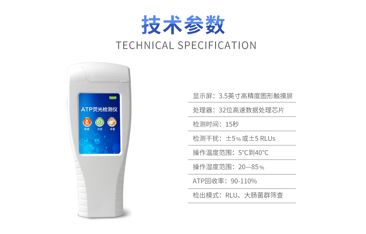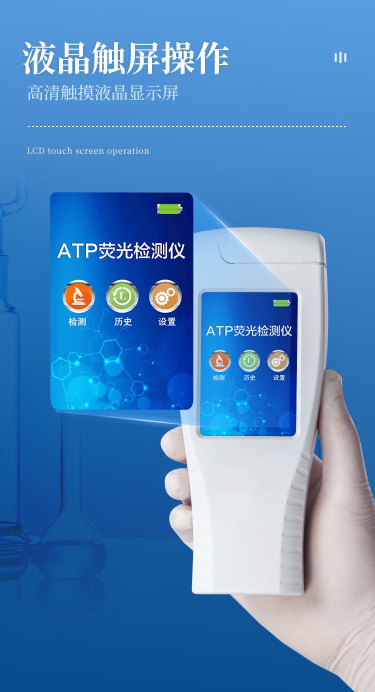 該設(shè)備為全新升級產(chǎn)品,大屏幕觸摸顯示屏,代替?zhèn)鹘y(tǒng)按鍵。操作采用生物化學(xué)反應(yīng)方法檢測ATP含量,ATP熒光檢測儀基于螢火蟲發(fā)光原理,利用“熒光素酶—熒光素體系”快速檢測三磷酸腺苷(ATP)。ATP拭子含有可以裂解細(xì)胞膜的試劑,能將細(xì)胞內(nèi)ATP釋放出來,與試劑中含有的特異性酶發(fā)生反應(yīng),產(chǎn)生光,再用熒光照度計(jì)檢測發(fā)光值,微生物的數(shù)量與發(fā)光值成正比,由于所有生物活細(xì)胞中含有恒量的ATP,所以ATP含量可以清晰地表明樣品中微生物與其他生物殘余的多少,用于判斷衛(wèi)生狀況。