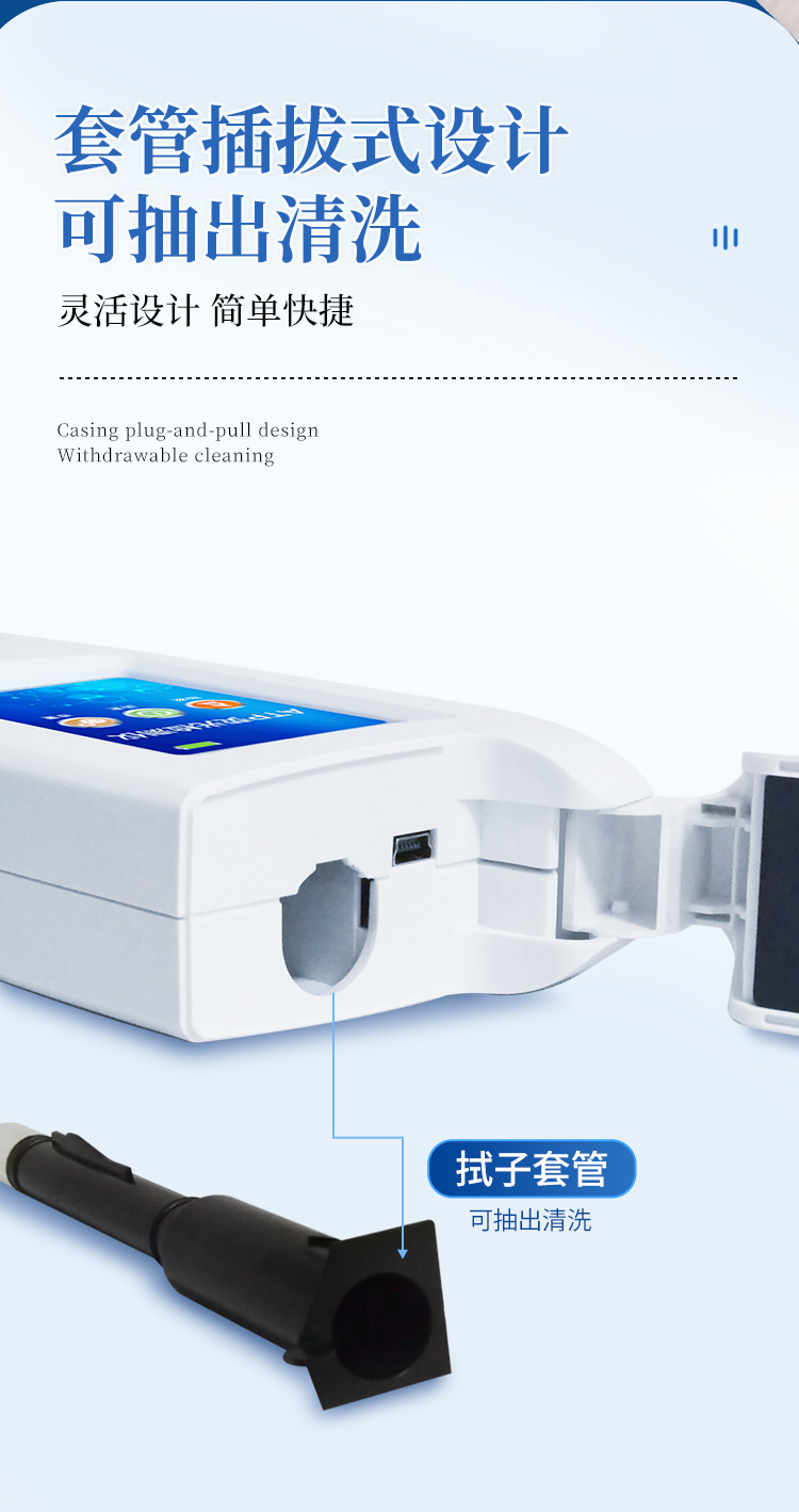 | 實(shí)用性 —— 可根據(jù)環(huán)境檢測需求設(shè)定上下限值,做到數(shù)據(jù)快速評估預(yù)警,表面潔凈度快速篩查。 | 靈敏度高 —— *************** | 速度快 —— 常規(guī)培養(yǎng)法18-24h以上,而ATP只需要十幾秒鐘 . | 可行性 —— 微生物數(shù)量與微生物體內(nèi)所含ATP有明確的相關(guān)性。 通過檢測ATP含量,可間接得出反應(yīng)中微生物數(shù)量 | 可操作性 —— 傳統(tǒng)培養(yǎng)方法需要在實(shí)驗(yàn)室由經(jīng)過培訓(xùn)的技術(shù)人員進(jìn)行操作;而ATP快速潔凈度檢測操作非常簡便,只需簡單的培訓(xùn)即可由一般工作人員進(jìn)行現(xiàn)場操作。 | 體驗(yàn)更好 —— 試子套管采用插拔式靈活設(shè)計(jì),可定期清洗長期使用,延長儀器壽命。 |
