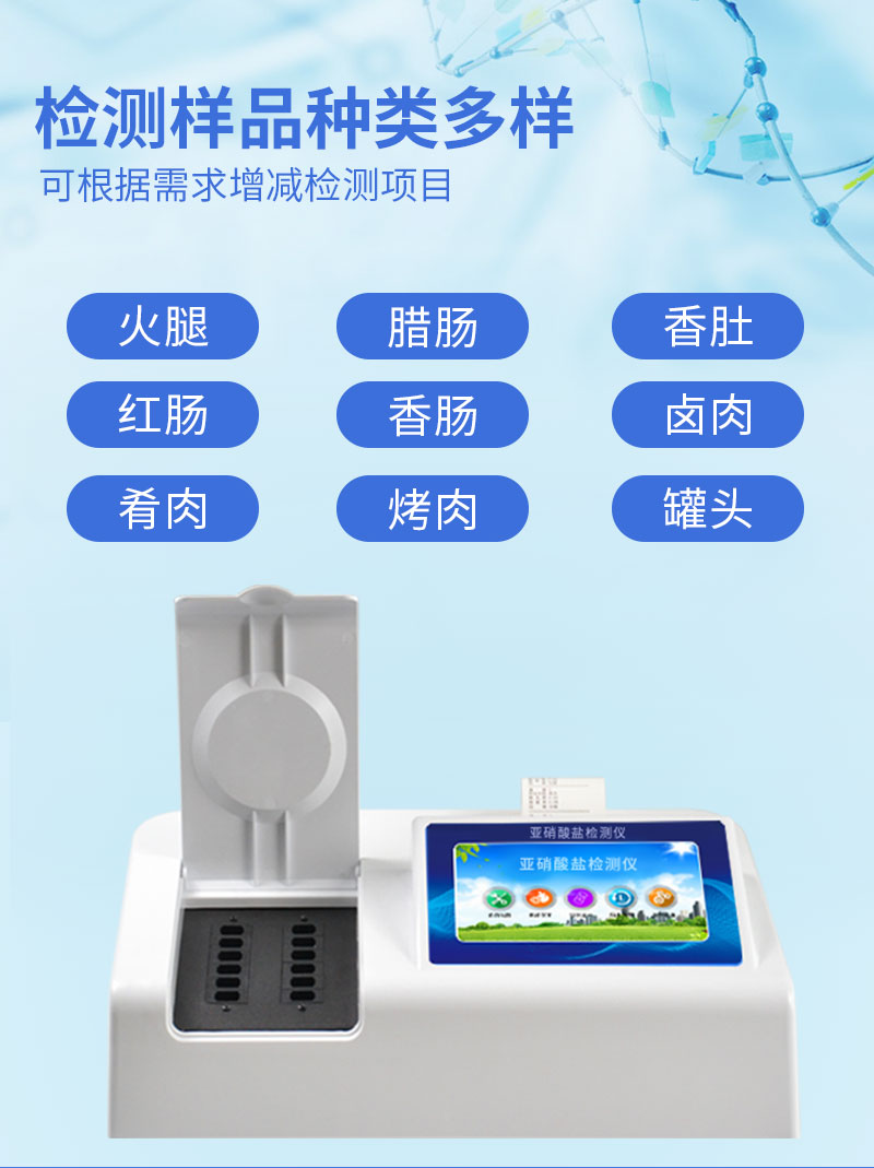 YT-Y12食品中亞硝酸鹽快速檢測(cè)儀為集成化食品安全檢測(cè)分析設(shè)備,能夠快速檢測(cè)肉類、肉類罐頭、熏肉、香腸、奶制品、泡菜、腌制蔬菜等中的亞硝酸鹽含量;該儀器是根據(jù)GB5009.33-2010《食品中亞硝酸鹽與硝酸鹽的測(cè)定》,食品中的亞硝酸鹽經(jīng)過提取,與檢測(cè)試劑反應(yīng)生成有色化合物,再利用亞硝酸鹽檢測(cè)儀測(cè)定其吸光度,在一定范圍內(nèi)吸光度與含量成正比。通過檢測(cè)可確定食品是否符合國(guó)家標(biāo)準(zhǔn)或是否為超標(biāo)毒害食品等。儀器預(yù)留其他項(xiàng)目檢測(cè)程序和端口,根據(jù)日后需求可方便的自主增加檢測(cè)項(xiàng)目。日后可升級(jí)為檢測(cè)水產(chǎn)品、面制品的綜合類型儀器。