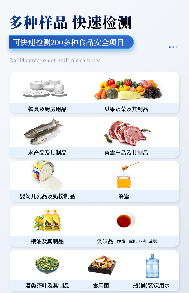 | 儀器采用手提式一體化系統(tǒng)檢測(cè)技術(shù),將分光光度模塊、膠體金檢測(cè)模塊、新型農(nóng)殘檢測(cè)模塊、數(shù)字化管理模塊、無(wú)線通訊模塊高度集成于一體,支持檢測(cè)200種食品安全檢測(cè)項(xiàng)目,同時(shí)預(yù)留升級(jí)檢測(cè)方法。 | 儀器檢測(cè)模塊標(biāo)準(zhǔn)化、智能化,檢測(cè)項(xiàng)目可隨意自由組合。檢測(cè)箱體內(nèi)置多個(gè)標(biāo)準(zhǔn)檢測(cè)單元,檢測(cè)模塊可以調(diào)整配置。 | 顯示屏幕:儀器采用10.1英寸液晶觸摸屏顯,搭配運(yùn)行安卓智能操作系統(tǒng),主控芯片采用ARM Cortex-A7,RK3288/4核處理器,主頻1.88Ghz,運(yùn)轉(zhuǎn)速度更快速,性能更強(qiáng)。 | 檢測(cè)通道:≥12通道;采用精密旋轉(zhuǎn)比色池設(shè)計(jì),使用光源芯片一致,可以解決各通道間由于光源芯片不同帶來(lái)的檢測(cè)結(jié)果誤差問(wèn)題,檢測(cè)結(jié)果更加精準(zhǔn),1-12通道間誤差0.1%,***:**202022821055.2。 | 儀器光源:高精度進(jìn)口四波長(zhǎng)冷光源,每個(gè)通道均配置 410、520、590、630nm 波長(zhǎng)光源,標(biāo)配**的光路切換裝置,專(zhuān)利光路切換功能可實(shí)現(xiàn)*多64波長(zhǎng),并且所有檢測(cè)項(xiàng)目可實(shí)現(xiàn)所有通道同時(shí)檢測(cè) | 設(shè)備具備開(kāi)機(jī)自動(dòng)校準(zhǔn)及一鍵校準(zhǔn)功能,確保檢測(cè)數(shù)據(jù)結(jié)果準(zhǔn)確。 | 通訊接口:配備無(wú)線通信模塊、4G(APN)通訊模塊、藍(lán)牙傳輸,同時(shí)具有雙USB接口以及RJ45網(wǎng)線接口,可以多方式實(shí)現(xiàn)數(shù)據(jù)保存及數(shù)據(jù)傳輸。 | 存儲(chǔ)方式:支持U盤(pán)存儲(chǔ),標(biāo)準(zhǔn)USB接口,免驅(qū)動(dòng)安裝。檢測(cè)結(jié)果存儲(chǔ)容量20萬(wàn)條以上,可生成Excel表格進(jìn)行拷貝,并具有登錄保護(hù)功能。 | 智能化操作系統(tǒng): 操作系統(tǒng):可在同一檢測(cè)界面自動(dòng)對(duì)應(yīng)相關(guān)檢測(cè)通道,一次性選擇1-12個(gè)樣品名稱(chēng),無(wú)需退出界面,節(jié)省操作時(shí)間。檢測(cè)通道可以分別打開(kāi)與關(guān)閉并對(duì)檢測(cè)通道屬性和樣品信息進(jìn)行編輯,例如送檢單位、人員,檢測(cè)人員等,打印時(shí)一并顯示。 數(shù)據(jù)集成系統(tǒng):設(shè)備首頁(yè)自動(dòng)統(tǒng)計(jì)檢測(cè)數(shù)據(jù),包含:周檢測(cè)數(shù)據(jù)、月檢測(cè)數(shù)據(jù),全部檢測(cè)總數(shù)量,均包含檢測(cè)總數(shù),合格數(shù),不合格數(shù),以及相關(guān)柱形分析圖,對(duì)各項(xiàng)檢測(cè)數(shù)據(jù)清晰掌握,無(wú)需電腦查詢(xún),更加快捷直觀。 數(shù)據(jù)庫(kù)系統(tǒng):具有多品類(lèi)多種類(lèi)樣品菜單功能,并且構(gòu)建了完善的檢索、修訂功能。食品庫(kù)涵蓋多種菜單庫(kù)100多種蔬菜名稱(chēng),可按需添加或刪除、編輯蔬菜名稱(chēng);不同的檢測(cè)通道可同時(shí)檢測(cè)不同的樣品,產(chǎn)品數(shù)據(jù)庫(kù)以及歷史檢測(cè)記錄支持一鍵檢索功能。 限量規(guī)判系統(tǒng):具有限量查詢(xún)、添加物質(zhì)合規(guī)判定系統(tǒng)。檢測(cè)出結(jié)果后,系統(tǒng)自動(dòng)調(diào)用系統(tǒng)數(shù)據(jù)庫(kù)中相關(guān)國(guó)標(biāo)進(jìn)行比對(duì)判定,客觀顯示判定結(jié)果是否合格。 項(xiàng)目預(yù)設(shè)系統(tǒng):儀器具有任務(wù)預(yù)設(shè)模塊,可在樣品送檢前提前預(yù)設(shè)樣品名稱(chēng)、檢測(cè)指標(biāo)、送檢單位、檢測(cè)單位等信息,樣品送檢時(shí)一鍵調(diào)取保存信息,并可多次調(diào)取,大大提高檢測(cè)效率。 數(shù)據(jù)監(jiān)管系統(tǒng):同步對(duì)接監(jiān)管平臺(tái),數(shù)據(jù)可局域網(wǎng)和互聯(lián)網(wǎng)數(shù)據(jù)上傳,檢測(cè)結(jié)果可選擇直接傳至食品安全監(jiān)管平臺(tái)。進(jìn)行區(qū)域食品安全監(jiān)管及大數(shù)據(jù)分析處理與數(shù)據(jù)統(tǒng)計(jì),檢測(cè)區(qū)域食品安全長(zhǎng)短期動(dòng)態(tài),達(dá)到食品安全問(wèn)題預(yù)估、預(yù)警。 自定義打印系統(tǒng):內(nèi)置熱敏打印機(jī);系統(tǒng)打印格式多樣化,產(chǎn)品合格證(國(guó)家農(nóng)業(yè)部標(biāo)準(zhǔn)要求),二維碼,抽樣信息、檢測(cè)信息,受檢信息、復(fù)核信息、抽樣日期、檢測(cè)日期等信息結(jié)果,可按實(shí)際需求自行設(shè)置開(kāi)啟或關(guān)閉,并完成打印。 | 供電模式:儀器主機(jī)采用一體化防水、抗壓、防撞擊、防腐蝕機(jī)體設(shè)計(jì),可直接使用交流電源;內(nèi)置6ah大容量充電鋰電池,可連續(xù)使用8小時(shí)以上,滿足脫電情況下檢測(cè)需求。 | 膠體金檢測(cè)模塊: 采用雙通道CMOS成像處理技術(shù)及膠體金免疫層析技術(shù),可同時(shí)讀取雙膠體金卡數(shù)據(jù),自動(dòng)采集、處理分析,將檢測(cè)結(jié)果顯示,并可根據(jù)參考限值自動(dòng)判斷檢測(cè)結(jié)果,可檢測(cè)常見(jiàn)的獸藥殘留、生物毒素、抗生素、違禁添加物等。 探測(cè)技術(shù):CMOS成像探測(cè); 檢測(cè)通道:3通道,可同時(shí)讀取3個(gè)膠體金卡數(shù)據(jù); 檢測(cè)方式:消線法和比色法; 顯示模式:陰性或陽(yáng)性; 曲線形式:軌道式自動(dòng)傳輸掃描方式,可實(shí)時(shí)顯示金標(biāo)卡