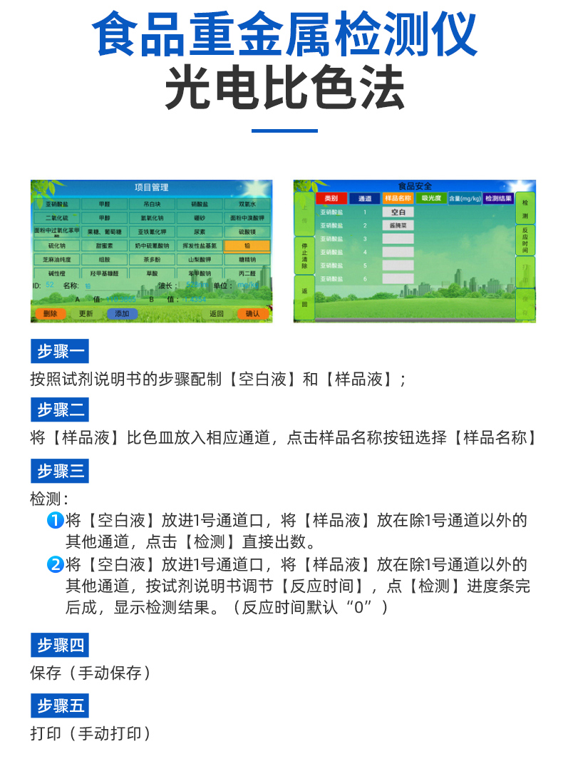 儀器采用臺式一體化系統(tǒng)檢測技術(shù),將分光光度模塊、新型農(nóng)殘檢測模塊、數(shù)字化管理模塊、無線通訊模塊高度集成于一體,支持檢測200種食品安全檢測項(xiàng)目,同時(shí)預(yù)留升級檢測方法。儀器檢測模塊標(biāo)準(zhǔn)化、智能化,可隨意自由組合。檢測箱體內(nèi)置多個(gè)標(biāo)準(zhǔn)檢測單元,檢測模塊可以調(diào)整配置。儀器采用全新安卓智能系統(tǒng),主控芯片采用 ARM Cortex-A7,RK3288/4核處理器,10.1寸高清液晶觸摸豎屏,更加**的UI交互界面,運(yùn)轉(zhuǎn)快捷;儀器配備無線通信模塊: 4G(APN)通訊模塊、Wifi模塊,藍(lán)牙傳輸,同時(shí)具有雙USB接口以及RJ45接口能以多種方式實(shí)現(xiàn)數(shù)據(jù)保存和數(shù)據(jù)傳輸功能。創(chuàng)新檢測模式:★檢測通道:≥12通道;采用精密旋轉(zhuǎn)比色池設(shè)計(jì),使用同芯片同光源校準(zhǔn)精度,解決不同光源之間的誤差值。1-12通道間誤差0.1%。(***:**202022821055.2)★儀器具有自動(dòng)識別比色皿檢測功能,即:將樣品比色皿放入儀器后,點(diǎn)擊樣品檢測,儀器自動(dòng)識別比色皿進(jìn)行通道檢測。進(jìn)口高精光源:高精度進(jìn)口四波長冷光源,通道配置 410、520、590、630nm 波長光源,一個(gè)光源芯片驅(qū)動(dòng)一個(gè)光源,誤差極小,每臺設(shè)備單獨(dú)**校準(zhǔn)光源,**比對,同時(shí)參照四種不同波段光源全方位覆蓋市面上99%的農(nóng)殘食品項(xiàng)目檢測。智能化操作系統(tǒng):便捷操作系統(tǒng):設(shè)備檢測時(shí)可在同一檢測界面自動(dòng)對應(yīng)相關(guān)檢測通道一次性選擇1-12個(gè)樣品名稱,無須退出界面,節(jié)省操作時(shí)間。數(shù)據(jù)集成系統(tǒng):設(shè)備首頁自動(dòng)統(tǒng)計(jì)檢測數(shù)據(jù)包含:周檢測數(shù)據(jù)、月檢測數(shù)據(jù),全部檢測總數(shù)量,均包含檢測總數(shù),合格數(shù),不合格數(shù),以及相關(guān)柱形分析圖,對各項(xiàng)檢測數(shù)據(jù)清晰掌握,無需電腦查詢,更加快捷直觀。項(xiàng)目預(yù)設(shè)系統(tǒng):支持添加單個(gè)及多個(gè)相同或不相同的任務(wù)預(yù)設(shè),一鍵快速調(diào)取,每一個(gè)任務(wù)分別可以設(shè)置不同的樣品、批次、編號、來源、備注、抽樣信息、檢測信息、受檢信息、復(fù)核信息等更多信息。無縫鏈接平臺和APP實(shí)時(shí)查看下發(fā)任務(wù)。數(shù)據(jù)監(jiān)管系統(tǒng):同步對接監(jiān)管平臺,數(shù)據(jù)可局域網(wǎng)和互聯(lián)網(wǎng)數(shù)據(jù)上傳,檢測結(jié)果可選擇直接傳至食品安全監(jiān)管平臺。集成OSS輸出存儲服務(wù)、區(qū)分設(shè)備定向管理應(yīng)用,進(jìn)行區(qū)域食品安全監(jiān)管及大數(shù)據(jù)分析處理與數(shù)據(jù)統(tǒng)計(jì),檢測區(qū)域食品安全長短期動(dòng)態(tài),達(dá)到食品安全問題預(yù)估、預(yù)警。自定義打印系統(tǒng):內(nèi)置全新打印系統(tǒng),新創(chuàng)自定義打印方式,可按需靈活設(shè)置開啟或關(guān)閉:產(chǎn)品合格證(國家農(nóng)業(yè)部標(biāo)準(zhǔn)要求),二維碼,抽樣信息、檢測信息,受檢信息、復(fù)核信息、抽樣日期、檢測日期等信息的打印。系統(tǒng)遠(yuǎn)程更新功能:可定向分客戶分儀器更新系統(tǒng),按照不同客戶后期實(shí)際需求添加項(xiàng)目,無需機(jī)器返廠,即可遠(yuǎn)程實(shí)時(shí)升級全新系統(tǒng),節(jié)省時(shí)間成本及避免運(yùn)輸造成設(shè)備損壞。儀器主機(jī)采用一體化防水、抗壓、防撞擊、防腐蝕箱體設(shè)計(jì),同時(shí)配備交直流供電,可連接車載電源,可選配大容量充電鋰電池,滿足現(xiàn)場野外檢測需求。安全證書,放心保障:儀器具有中國計(jì)量科學(xué)研究院校準(zhǔn)證書,權(quán)威認(rèn)證。